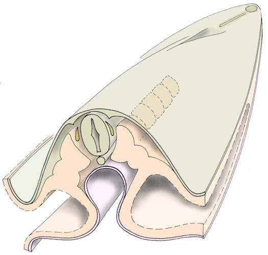 Folding of neural plateThe neural plate begins to fold, forming the neural groove. Closure to form the neural tube begins in the future midbrain region, and then extends cranially and caudally. Neural crest cells migrate away from the site of closure and later take numerous roles within the body, forming peripheral neurons, Schwann cells, melanocytes, and head and neck structures.